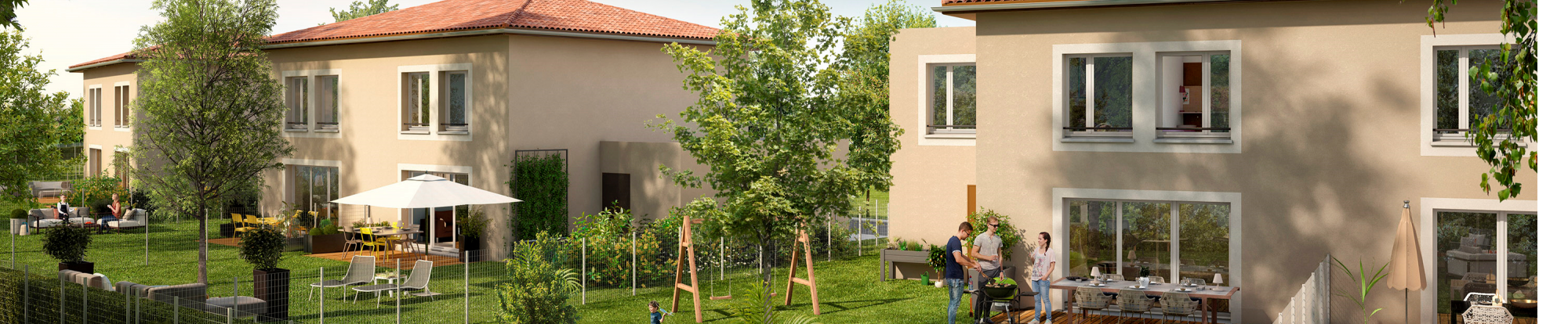 Façades lumineuses aux enduits sobres, toitures en tuiles rouges, toutes les maisons profitent d'une orientation idéale : nord côté rue et sud côté jardin.
