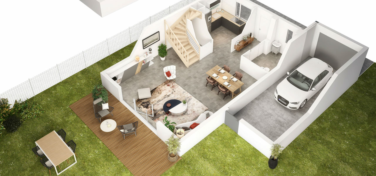 - évier simple bac inox et mitigeur, plaques de cuisson vitrocéramique 4 feux, hotte à recyclage, réfrigérateur colonne double porte avec bac congélateur de classe A, meubles bas suivant implantation de l'architecte. Faïence au mur